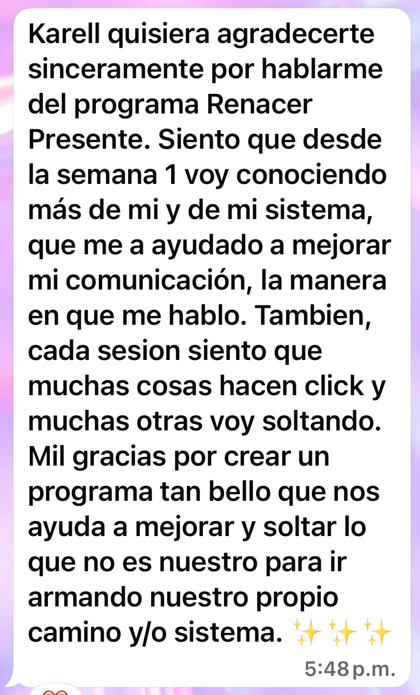 No necesitas seguir cargando sola, ni repitiendo las mismas historias. Renacer Presente es una puerta concreta, guiada y amorosa para transformar tu relación con tu pasado, tu presente y contigo.